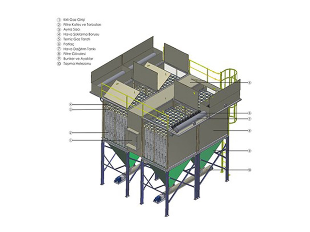 • Filtre Torbaları : Prosese göre özel olarak seçilen Torba Filtreleme Yüzeyi ile Bakım ve işletme maliyetleri azaltılarak, Torbalarda çok daha iyi yüzey temizleme ve basınçlı hava darbeli temizlik sağlanır.